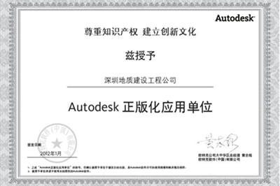 MORE>我公司长期以来高度重视软件正版化工作,尊重知识产权作为企业发展的重要文化。通过和欧特克(中国)有限公司的深度合作,成为区域性地质企业全面使用Autodesk CAD、CIVIL 3D重要用户,欧特克公司授予我公司“Autodesk正版化应用单位”称号。 ..
