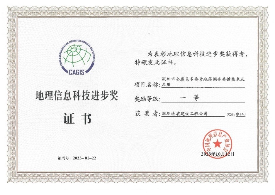 MORE>近期,中国地理信息产业协会公布2023地理信息科技进步奖评选结果,深圳地建联合深圳市规划和自然资源局、深圳市规划和自然资源调查测绘中心、深圳市规划和自然资源数据管理中心、武汉大学共同完成的《深圳市全覆盖多要素地籍调查关键技术及应用》项目喜获2023地理信息科技进步奖一等奖荣誉。 “地理信息..