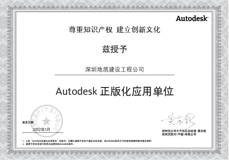 我公司长期以来高度重视软件正版化工作,尊重知识产权作为企业发展的重要文化。通过和欧特克(中国)有限公司的深度合作,成为区域性地质企业全面使用Autodesk CAD、CIVIL 3D重要用户,欧特克公司授予我公司“Autodesk正版化应用单位”称号。 (撰文:办公室)