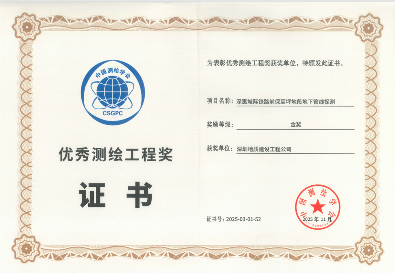 深惠城际铁路前保至坪地段地下管线探测项目获奖证书